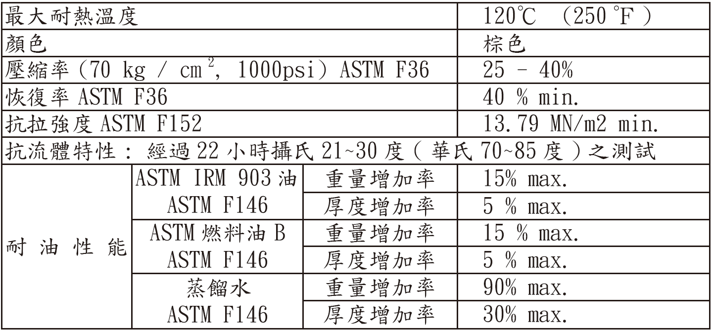 耐油紙 產品敘述 蔬菜纖維耐油接合墊片又稱耐油紙墊片或柴油紙墊片,色澤土黃色,不含石棉成分。廣泛用在ㄧ般汽車、機車工業的汽機油系統密合墊片材料。也是適合用於各類工業及工廠的潤滑油及溶劑系統之密合耐油墊片材料。最大耐溫120 度,不適合做工業的密封墊片材料,具有高度柔韌性和壓縮性,容易加工裁切成型。 物理性質