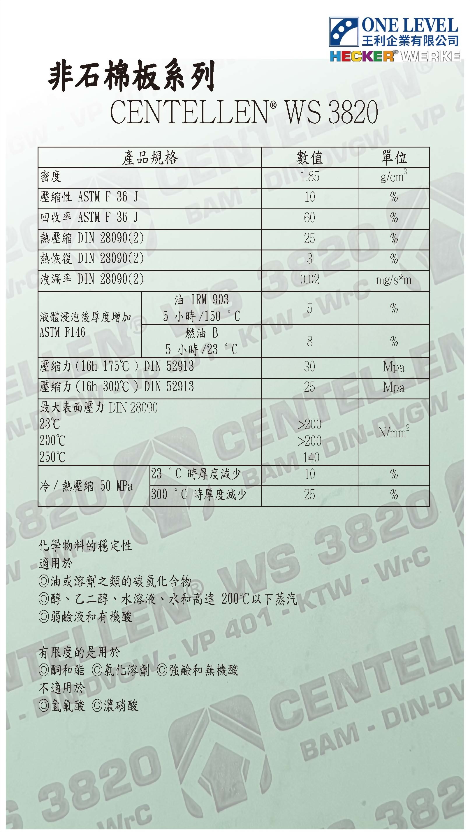 HECKER - WS 3820 型號 : 德國雙面抗黏 產品敘述 規格 WS 3820 是依照砑光操作流程所製造的。除此之外它還涵蓋丁晴橡膠當作粘結劑。這些密封板擁有絕佳的抗粘性及最薄的表面厚度,並且不會改變它的化學特性。WS 3820 是我們的廣用性產品,可達高度機械穩定值;它的氣密度符合所有氣態供應產業的氣密度要求標準。 標準板 綠色 抗黏塗料OBY2 標準交貨規格 1000*1500mm 1500*2000mm 1500*3000mm 1500*4500mm 可要求其他尺寸 厚度0.5、1.0、1.5、2.0、3.0 mm 公差 厚度符合規格(符合 DIN 28091-1) 長度 ±50 毫米,寬度 ±50 毫米